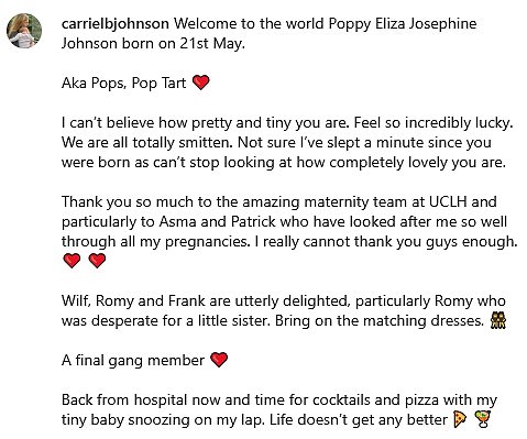 Mrs Johnson posted to Instagram This afternoon to share the news, stating: 'Welcome to the world, Poppy Eliza Josephine Johnson, born on May 21st. Known as Pops or Pop Tart.'